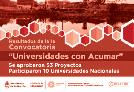 A partir de que se llevara adelante la 1ª Convocatoria de Proyectos de Extensión Universitaria “Universidades con Acumar” se presentaron y cargaron en la plataforma 131 proyectos de los cuales 53 fueron aprobados por los evaluadores de la Subsecretaría de Políticas Universitarias. La convocatoria apunta a afianzar la relación entre la Autoridad de Cuenca Matanza Riachuelo (ACUMAR) y las Universidades Nacionales situadas en las inmediaciones, con el objetivo de poder trabajar conjuntamente en la elaboración de estrategias que permitan dar respuesta a las necesidades de la región.